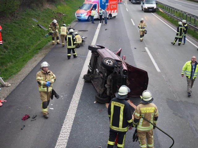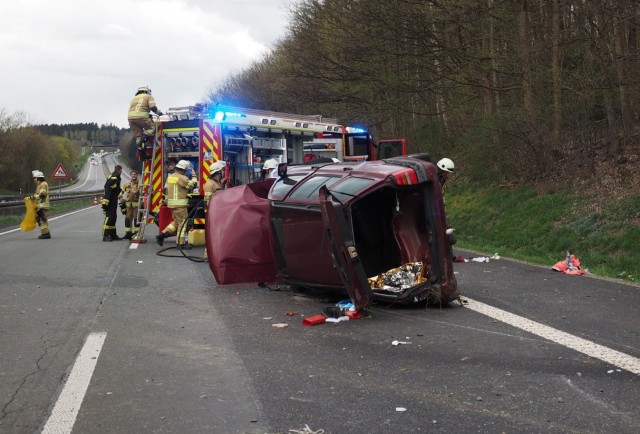 Reichshof - Eine Schrecksekunde auf der BAB 4 erlebten Autofahrer heute, als sich vor ihnen ein mit vier Personen besetztes Fahrzeug überschlug. Aus bislang ungeklärter Ursache war der VW-Golf von der Fahrbahn abgekommen, bevor er nach mehrfachem Überschlag auf dem Dach liegend auf der Fahrbahn landete. Im Fahrzeug wurden alle Insassen verletzt, eine Frau schwebt in Lebensgefahr.