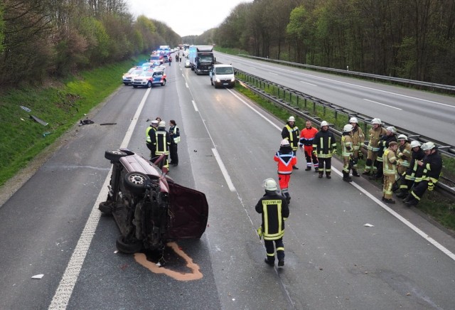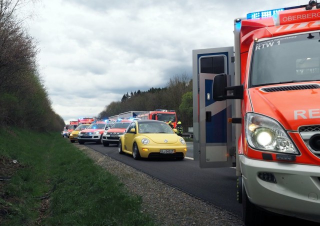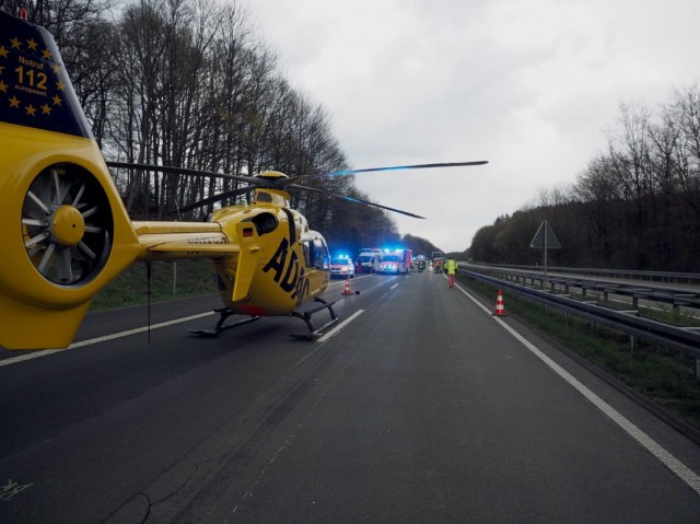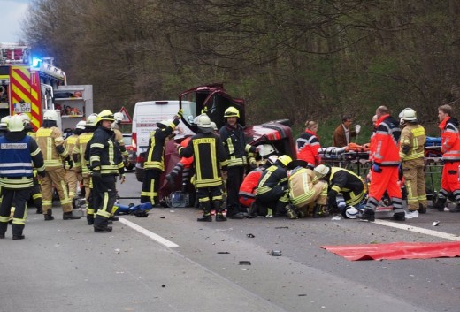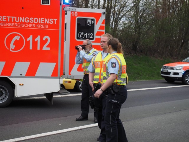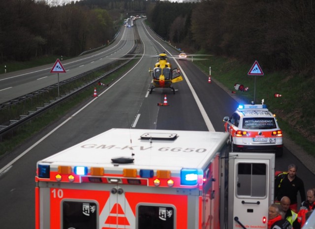 Notarzt, Rettungswagen und die Einheiten der Feuerwehr West, Mittelagger, Reichshof und Bergneustadt mussten sich durch einen dichten Stau kämpfen, bevor sie an der Unfallstelle zum Einsatz kommen konnten. Von den vier Insassen im VW-Golf, wurden drei Männer schwerverletzt in umliegende Krankenhäuser gebracht. Eine Frau mit lebensgefährlichen Verletzungen sollte zunächst mit dem Rettungshubschrauber „Christoph 25“ in eine Klinik geflogen werden. Bedingt durch die sich drastisch verschlechternde Wetterlage, die einen Flug mit derart schweren Verletzungen unmöglich machte, wurde die Patientin schließlich mit einem Rettungswagen in eine Klinik gefahren. Der RTH konnte erst nach rund einer Stunde ohne die aufgenommene Patientin starten. Die BAB 4 war für mehrere Stunden in Fahrtrichtung Köln voll gesperrt. (dbl.-12.04.2016 22:09)(aktualisiert-13.04.2016 08:55)