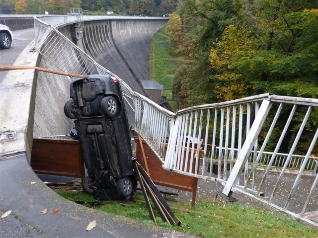 Glücklicherweise wurde der PKW von dem Geländer in der Bewegung gestoppt und kam im Randbereich der Staumauer auf einem Vorsprung zum Stillstand. Die Insassen, neben dem Fahrer befanden sich noch ein 32-jähriger Beifahrer und ein einjähriges Kind im Fahrzeug, konnten sich äußerlich unverletzt aus dem Wagen befreien. Sie wurden vorsorglich mit einem Rettungswagen zur Untersuchung in ein Krankenhaus gebracht.