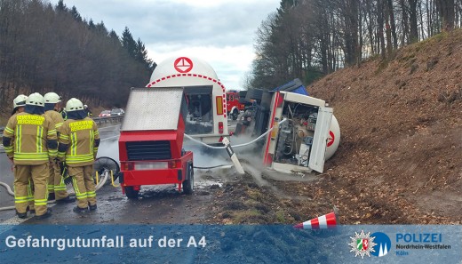 Eckenhagen - Ein Gefahrgut-Lkw ist am Montagmittag auf der BAB 4 zwischen den Anschlussstellen Eckenhagen und Reichshof-Bergneustadt umgekippt. Der Fahrer (49) wurde schwer verletzt. Die Richtungsfahrbahn Köln war vorübergehend voll gesperrt.
