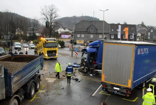 Wipperfürth - Mit schweren Verletzungen musste ein 37-jähriger LKW-Fahrer aus Polen nach einem Verkehrsunfall von der Feuerwehr aus seinem Fahrzeug befreit werden. Der Mann war heute (6.3.) gegen elf Uhr mit einem LKW-Zug auf der Bundesstraße 237 von Wipperfürth in Richtung Marienheide unterwegs. An der Kreuzung mit der Bundesstraße 256 beabsichtigte er nach links in Richtung Kierspe-Rönsahl abzubiegen. Dabei stieß er im Kreuzungsbereich frontal mit einem mit Kies beladenen Lastwagen zusammen, der ihm aus Richtung Marienheide entgegenkam. Die Wucht des Aufpralls deformierte das Führerhaus des polnischen LKW so stark, dass der Fahrer erst nach einiger Zeit von den Rettungskräften befreit werden konnte. Er kam mit schweren Verletzungen in ein Krankenhaus. Mit leichten Verletzungen kamen der aus Wiehl stammende, 52-jährige Fahrer des Kieslasters sowie ein 71-jähriger PKW-Fahrer aus Wermelskirchen davon. Der 71-Jährige hatte rechts an dem abbiegenden Lastwagen vorbeifahren wollen. Durch den Zusammenprall brach der Anhänger des LKW-Gespannes nach rechts aus und traf dabei den in Richtung Marienheide fahrenden Wagen. Aufgrund der umfangreichen Rettungs- und Bergungsmaßnahmen konnte die Kreuzung erst gegen 17:15 Uhr wieder für den Verkehr freigegeben werden. (red.-06.03.2017 19:25)