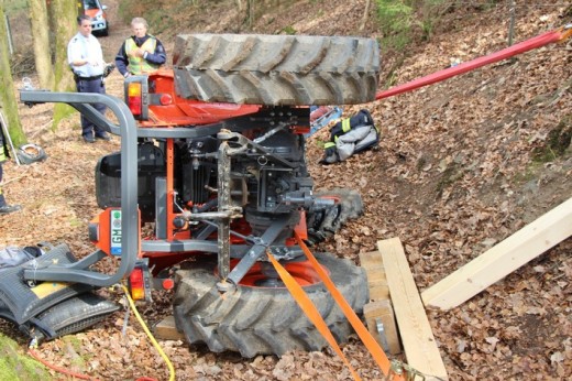 Ein 66-jähriger Waldbröler befuhr mit dem Traktor den Waldweg in Richtung Vierbuchermühle. Kurz vor der Ortschaft geriet der Traktor in einer scharfen Rechtskurve ins Kippen und fiel auf die linke Seite. Während der Fahrer noch vom Fahrzeug springen konnte, geriet der 13-jährige Junge, der neben dem Traktor herlief, mit einem Fuß unter das Fahrzeug. Die eingesetzte Feuerwehr richtete das Fahrzeug auf und konnte den Jungen bergen. Er wurde schwerverletzt in ein Krankenhaus gebracht. Am Fahrzeug entstand kein Schaden.