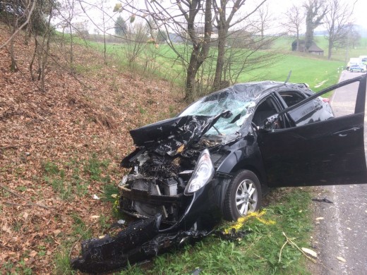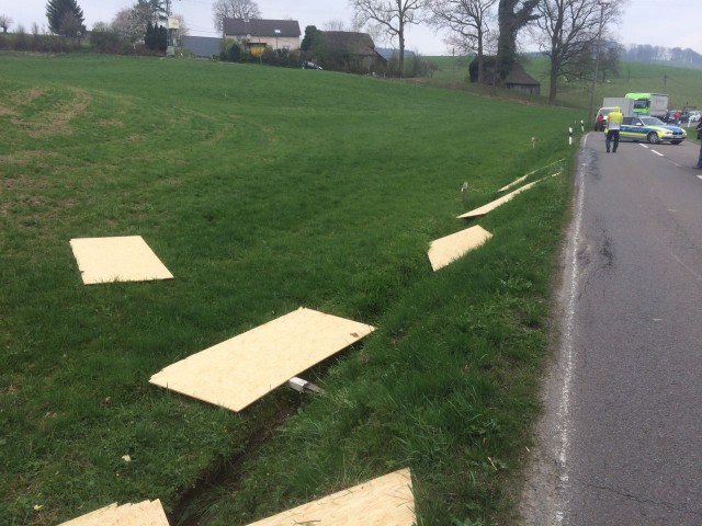 In einer leichten Rechtskurve stießen die überstehenden Platten zunächst gegen einen Baum am rechten Straßenrand und wurden dann von der Ladefläche auf den Fahrstreifen des Gegenverkehrs geschleudert. Hier trafen sie den PKW der 23-Jährigen, die im Anschluss nach rechts von der Fahrbahn abkam und im Straßengraben zum Stillstand kam. Die Fahrerin erlitt bei dem Unfall schwere Verletzungen, hatte aber trotzdem großes Glück, dass die Holzplatten nicht die Frontscheibe des Autos durchschlugen. Da der PKW nach dem Unfall Betriebsstoffe verloren hatte, veranlasste die Straßenmeisterei den Aushub des betroffenen Erdreichs. Die L 302 war bis 13.10 Uhr gesperrt. (red.-10.04.2017 16:38)