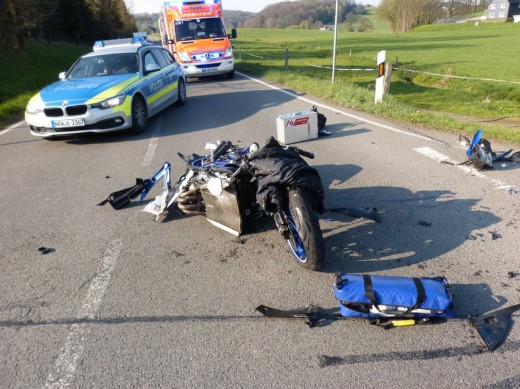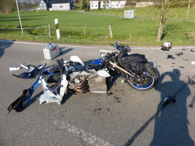 Wipperfürth - Schwere Verletzungen davongetragen hat gestern (20. April) ein 30-Jähriger aus Radevormwald bei dem Zusammenstoß mit einem abbiegenden PKW. Der Kradfahrer fuhr gegen 17.40 Uhr auf der Kreisstraße 11 von der Bever aus kommend in Richtung Radevormwald. Ausgangs einer Linkskurve kam ihm auf der Kreisstraße eine 72-jährige Autofahrerin aus Wipperfürth entgegen, die in diesem Moment nach links in die Straße Bruch abbog. Der Motorradfahrer konnte dem PKW nicht mehr ausweichen - er kam nach dem Zusammenstoß mit dem Wagen zu Fall. Das Motorrad wurde bei dem Unfall völlig zerstört. Während der Unfallaufnahme war die Kreisstraße 11 für etwa eine Stunde gesperrt. (red.-21.04.2017 15:00)