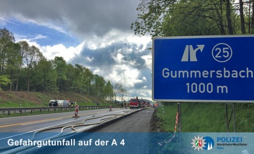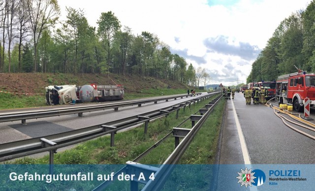 Gummersbach - Am Donnerstagabend (11. Mai) ist ein tschechischer Gefahrguttransporter auf der Bundesautobahn 4 in einer Baustelle bei Gummersbach verunglückt. Die Feuerwehr befreite den lebensgefährlich verletzten Fahrer (51) aus dem Führerhaus. Der mit hochexplosiver Flüssigkeit beladene Sattelzug wird seit den frühen Morgenstunden durch Spezialfirmen unter Aufsicht der Feuerwehr geborgen. Die BAB 4 bleibt voraussichtlich bis zum Abend zwischen den Anschlussstellen Engelskirchen und Gummersbach in beide Fahrtrichtungen gesperrt.