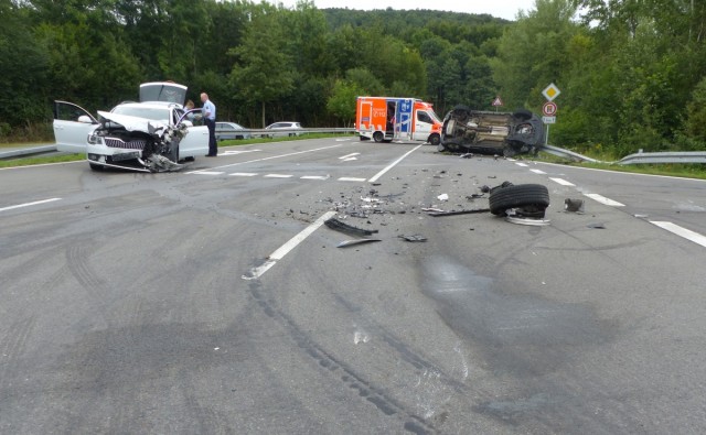 Ein 52-Jähriger aus Nümbrecht wollte gegen 17:30 Uhr von der B 56 nach links auf die Autobahn in Richtung Olpe auffahren. Dabei übersah er offenbar einen 56-Jährigen aus Haiger, der ihm auf der B 56 entgegenkam. Nach dem Zusammenstoß kippte der Wagen des 56-Jährigen auf die rechte Seite und rutschte gegen eine Leitplanke. Mit leichten Verletzungen musste der 56-jährige Fahrer in ein Krankenhaus gebracht werden. Während der Räum und Reinigungsarbeiten war die Unfallstelle bis etwa 19:00 Uhr gesperrt. (red.-03.08.2017 16:00)