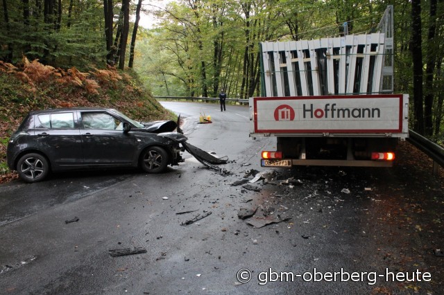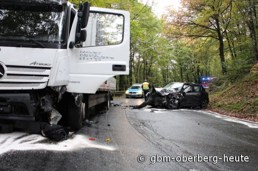 Morsbach - Nach einem Verkehrsunfall gegen 14.15 Uhr zwischen einem PKW und einem LKW in Morsbach-Frankenthal war die Landstraße 336 für mehrere Stunden gesperrt. Nach bisherigen Erkenntnissen verlor ein 31-jähriger Autofahrer aus Gummersbach in einer Kurve auf regennasser Fahrbahn die Kontrolle über sein Fahrzeug. Der Wagen geriet auf den Fahrstreifen des Gegenverkehrs, wo ein 48-Jähriger aus Wenden mit einem LKW in Richtung Morsbach-Zentrum unterwegs war. Die Fahrzeuge prallten im Frontbereich zusammen, wobei der Gummersbacher schwere Verletzungen davontrug. Ein 28 Jahre alter Beifahrer sowie der LKW-Fahrer kamen vermutlich mit leichten Verletzungen davon.