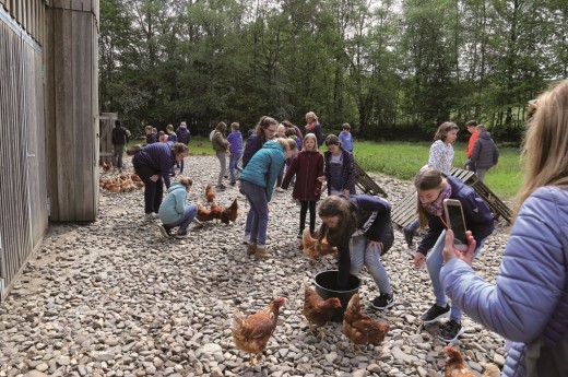 Von dort zog das Trüppchen weiter in die Stallgasse. Umkurvt von den Schwalben, die sich in Nestern unter der Decke häuslich eingerichtet hatten, erfuhren die Fünftklässler von Andreas Klose, was Hühner fressen, wie sie ihren Tag verbringen und wann sie Eier legen. A propos Hühner: Die hörte man hinter der Stalltür schon interessiert gackern, und so leitete Klose von der Theorie zur Praxis über.