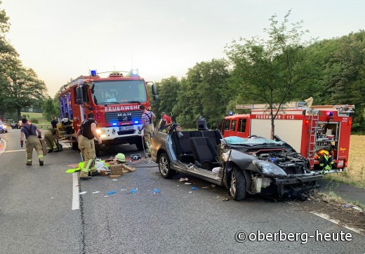 Waldbröl - Am 25.07.2019, gegen 20:00 Uhr kam es auf der Bundesstraße 256 zwischen Waldbröl- Hermesdorf und Reichshof-Denklingen zu einem Frontalzusammenstoß zweier Pkw, der drei schwerverletzte und eine leichtverletzte Person forderte. Zur Unfallzeit befuhr eine 41-jährige Frau aus Windeck mit einem Pkw die Bundestraße aus Denklingen kommend in Richtung Hermesdorf. Etwa 200 m vor dem Ortseingang Hermesdorf kam sie mit dem Fahrzeug aus bislang ungeklärter Ursache auf die Gegenfahrbahn ab und stieß dort frontal mit dem Pkw einer 27-jährigen Frau aus Waldbröl zusammen. Beide Fahrerinnen und eine 54-jährige Mitfahrerin der Unfallbeteiligten aus Waldbröl wurden schwerverletzt. Desweiteren verletzte sich die 15-jährige Begleiterin der Pkw-Fahrerin aus Windeck leicht. Die verletzten Personen wurden nach notärztlicher Versorgung am Unfallort mit Rettungswagen in umliegende Krankenhäuser gebracht. Durch den heftigen Zusammenprall waren beide Pkw nicht mehr fahrbereit und mussten abgeschleppt werden. Es entstand hoher Sachschaden. Die Bundestraße musste für die Zeit der polizeilichen Verkehrsunfallaufnahme und für die Fahrbahnreinigung durch die Feuerwehr für ca. drei Stunden komplett gesperrt werden. (red.-26.07.2019 03:26)