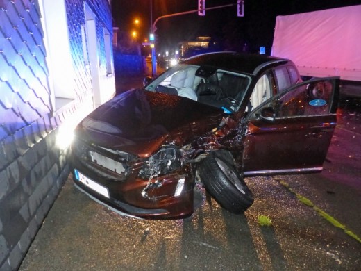 Durch die Wucht des Aufpralls wurde der PKW anschließend herumgeschleudert und kam an einer Hauswand zum Stehen, die dabei ebenfalls leichte Beschädigungen davontrug. Der Fahrer des Autos, ein 46-Jähriger aus Radevormwald, musste mit einem Rettungswagen in ein Krankenhaus eingeliefert werden; zum Glück erlitt er aber lediglich leichtere Verletzungen. Die Vorfahrt ist an der Kreuzung mittels einer Lichtzeichenanlage geregelt.
