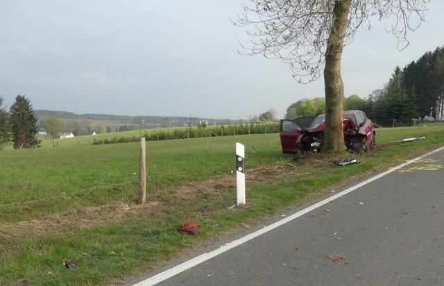 Radevormwald - Schwere Verletzungen haben sich am Samstagabend ein 21-jähriger Alpha Romeo-Fahrer und sein 20 Jahre alter Beifahrer zugezogen. Der 21-Jährige Schwelmer fuhr um 18:15 Uhr mit seinem Alpha Romeo auf der B 483 aus Richtung Wellingrade kommend in Fahrtrichtung Freudenberg. Nach einer Rechtskurve verlor er die Kontrolle über seinen Wagen. Er kam nach rechts von der Fahrbahn ab und prallte frontal gegen einen Baum.