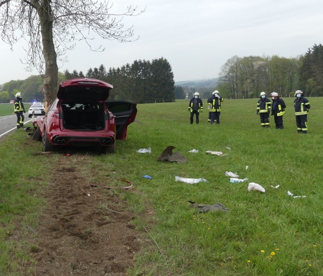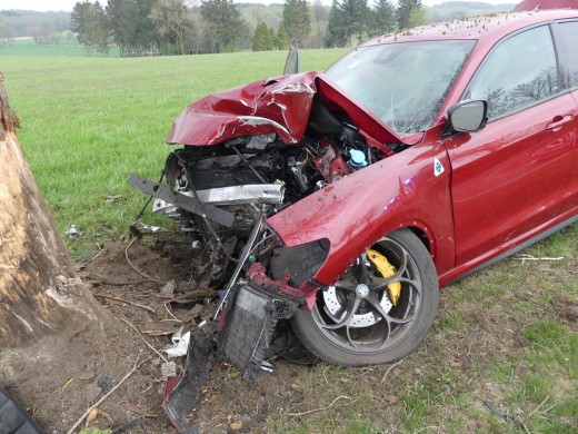 Radevormwald - Schwere Verletzungen haben sich am Samstagabend ein 21-jähriger Alpha Romeo-Fahrer und sein 20 Jahre alter Beifahrer zugezogen. Der 21-Jährige fuhr um 18:15 Uhr mit seinem Alpha Romeo auf der B 483 von Wellingrade nach Freudenberg. Nach einer Rechtskurve verlor er die Kontrolle über seinen Wagen. Er kam nach rechts von der Fahrbahn ab und prallte frontal gegen einen Baum.
