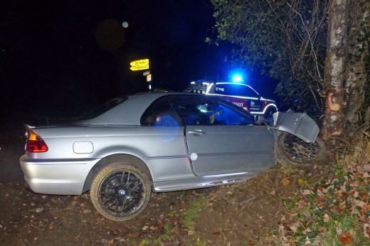 Nach einer Linkskurve verlor er die Kontrolle über seinen BMW und geriet nach rechts auf den unbefestigten Seitenstreifen. Im weiteren Verlauf schleuderte der BMW mit der Beifahrerseite voran gegen einen Baum. Die Aufprallenergie war dabei so groß, dass der Wagen in zwei Teile gerissen wurde.