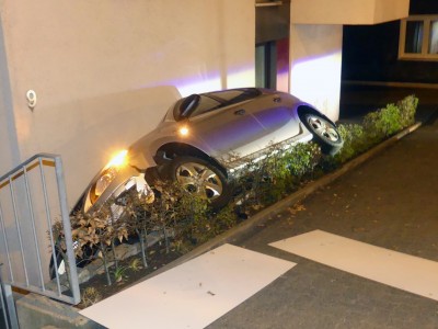 Gummersbach - Zu einem Verkehrsunfall kam es heute Nacht, gegen 01:20 Uhr in Gummersbach auf der La-Roche-sur-Yon-Straße bei dem ein Wagen in Schräglage zwischen einer Hauswand und dem höher gelegenen Gehweg stecken blieb.