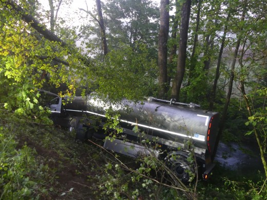 Gegen 03.30 Uhr war der 27-jährige Fahrer aus Nümbrecht auf der L 284 in Richtung Lindlar gefahren, als er etwa 200 Meter vor der Einmündung mit der L 84 nach rechts von der Fahrbahn abkam. Der aus einem Zugfahrzeug und Anhänger bestehende Milchtankzug fuhr eine etwa fünf Meter tiefe, mit Bäumen und Strauchwerk bewachsene Böschung hinab und kam nach dem Aufprall vor einen Baum zum Stehen. Der Fahrer konnte sich selbst aus dem stark beschädigten Führerhaus befreien und die Rettungskräfte verständigen. Er erlitt vermutlich nur leichtere Verletzungen, verblieb aber zur Beobachtung zunächst im Krankenhaus. Gegenüber der Polizei gab er an, dass am Steuer eingeschlafen sei, weshalb die Polizei den Führerschein beschlagnahmte.