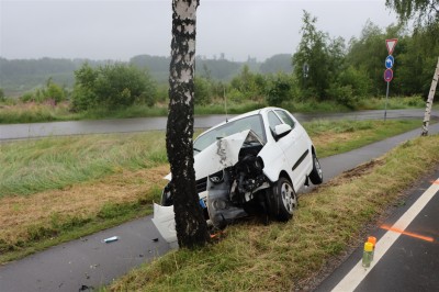 Marienheide - Schwere Verletzungen hat sich am Donnerstagabend eine 48-jährige Autofahrerin zugezogen. Sie war frontal gegen einen Baum gefahren. Die 48-jährige Marienheiderin fuhr mit ihrem weißen Kia um 19.20 Uhr von Meinerzhagen kommend auf der Müllenbacher Straße in Fahrtrichtung Rodt. Aus bislang ungeklärter Ursache kam sie in einer Linkskurve auf regennasser Fahrbahn mit nicht angepasster Geschwindigkeit nach rechts von der Fahrbahn ab und kollidierte dort frontal mit einem Baum. Die 48-Jährige zog sich bei dem Unfall schwere Verletzungen zu. Ein Rettungswagen brachte sie zur stationären Behandlung in ein Krankenhaus. An ihrem Kia entstand Totalschaden. (red.-02.07.2021 07:41)