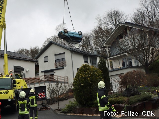Für die Bergung des Autos musste ein Kranwagen anrücken, der den Unfallwagen über das Haus hinweghob. Die Polizei stellte den Fiat sicher, da ein technischer Defekt nicht auszuschließen war. (red.-02.04.2023 14:08)