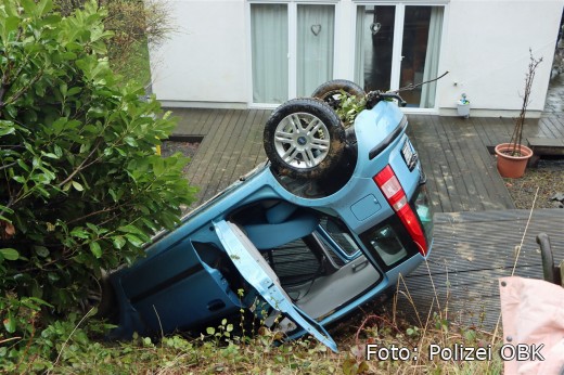 Eine 41-jährige Gummersbacherin hatte gegen 14.40 Uhr mit ihrem Fiat den Parkplatz eines Mehrfamilienhauses an der Alexander-Fleming-Straße befahren. Aus noch nicht geklärter Ursache verlor sie dabei die Kontrolle über Ihren Wagen. Am Ende einer abschüssigen Zufahrt durchbrach der Fiat zunächst ein Geländer und geriet in die dortigen Grünanlagen. Auf dem weiter abfälligen Gelände legte das Auto noch etwa 50 Meter zurück, wobei es eine Hecke durchbrach, sich überschlug und schließlich mit dem Dach nach unten auf der Terrasse eines Einfamilienhauses zum Stillstand kam.