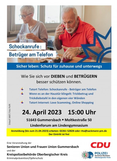 Damit Sie vor solchen Tricks gefeit sind, bietet die Kriminalprävention der Polizei in Kooperation mit der Senioren Union und Frauen Union Gummersbach am 24. April eine kostenlose Beratung im Lindenforum in der Moltkestraße an. Dabei gibt Ihnen die Polizei viele Tipps mit an die Hand, wie Sie Betrügereien dieser Art schnell entlarven können.