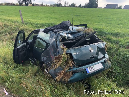 Marienheide - Auf der Kreisstraße 18 hat sich am Donnerstagmittag ein VW Golf überschlagen. Alle vier Insassen erlitten dabei leichte Verletzungen. Gegen 12.45 Uhr war ein 18-jähriger Gummersbacher mit einem VW Golf auf der K 18 aus Richtung Wipperfürth kommend in Richtung Marienheide gefahren. In Höhe der Ortslage Scharde verlor er in einer Kurve die Kontrolle über sein Auto, geriet nach rechts in den Straßengraben und überschlug sich dort.