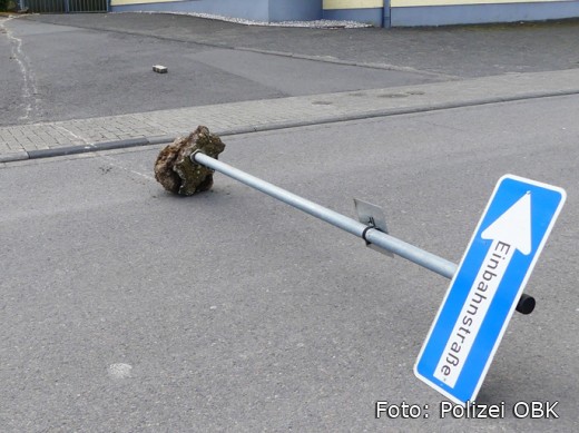 Waldbröl - Zwischen 18 Uhr am Samstag (27. April) und 6 Uhr am Sonntag rissen Unbekannte ein Einbahnstraßenschild aus dem Boden und ließen es auf der Fahrbahn des Friedrich-Engelbert-Weg liegen. Zudem warfen die Unbekannten einen Schrankenzaun einen angrenzenden Abhang hinunter. Die Straße war zur Tatzeit für Verkehrsteilnehmer gesperrt, sodass keine Gefährdung bestand.