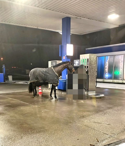 | Das gestohlene Pferd an der Tankstelle in Meinerzhagen (Foto: Kreispolizeibehörde Märkischer Kreis) |