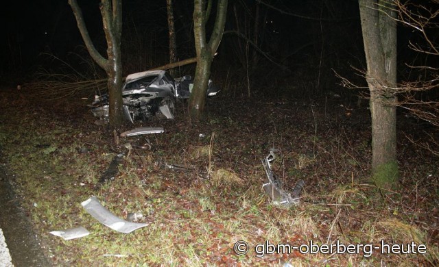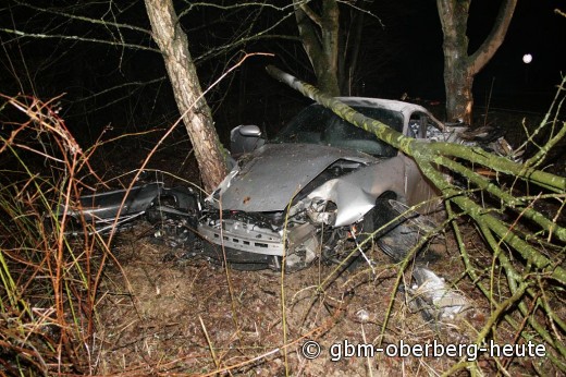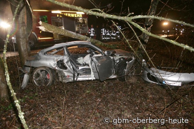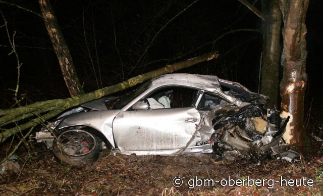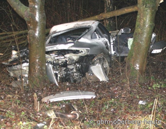 Waldbröl - Offenbar wegen nicht angepasster Geschwindigkeit kam ein Porschefahrer gegen 17.40 Uhr am Montag auf der B 478 in Höhe Ziegenhardt von der Fahrbahn ab. Der PKW fällte einige Bäume und wurde völlig zerstört.