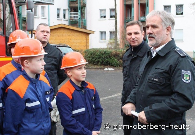 | Veit Mach (r.), Leiter der Feuerwehr und sein Stellvertreter, Stadtbrandinspektor Daniel Wendler, erklärten den Kindern und Jugendlichen der Jugendfeuerwehr Waldbröl, "dass es bei der Feuerwehr nicht auf die Streifen auf der Schulter, sondern auf die Bereitschaft und innere Einstellung ankommt". |