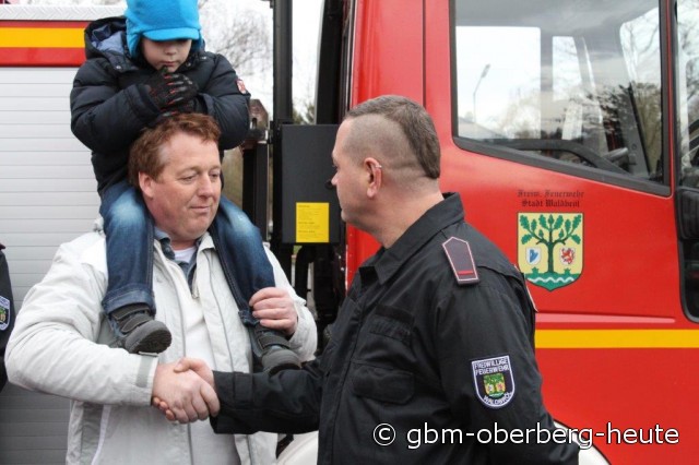 | Eduard Repsch (r.), Leiter der Jugendfeuerwehr Waldbröl, bedankt sich bei Paul W. Giebeler, der stellvertretend für weitere Sponsoren die Jugendfeuerwehr besuchte. |