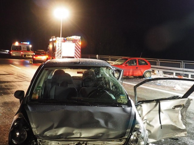 Bergneustadt - Vier lebensgefährlich verletzte Unfallbeteiligte (47, 48, 72, 74w) und zwei totalbeschädigte Pkw sind die Bilanz eines frostbedingten Crashs auf der Bundesautobahn 4 am Samstagabend (16. Januar). Gegen 18 Uhr kollidierten auf der Alpebachtalbrücke ein Honda und ein Opel Corsa.