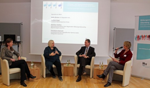 | Fernsehjournalistin Anke Bruns (r.) moderierte die Gesprächsrunde mit Landrat Jochen Hagt, Martina Galiliea (g.l., Bezirksregierung Köln) und Christian Bainski (2.v.l., Landeskoordinierungsstelle der Kommunalen Integrationszentren) zum Thema Durchgängige Sprachbildung (Foto: OBK). |