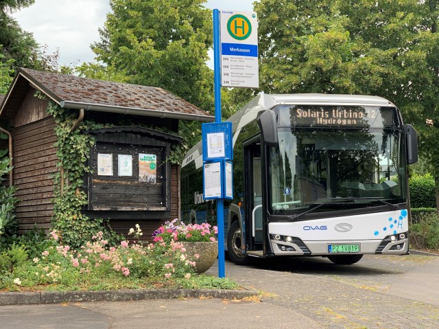 | Solaris-Wasserstoffbus im Testeinsatz im Oberbergischen (Sommer 2023 /Foto: OVAG) |