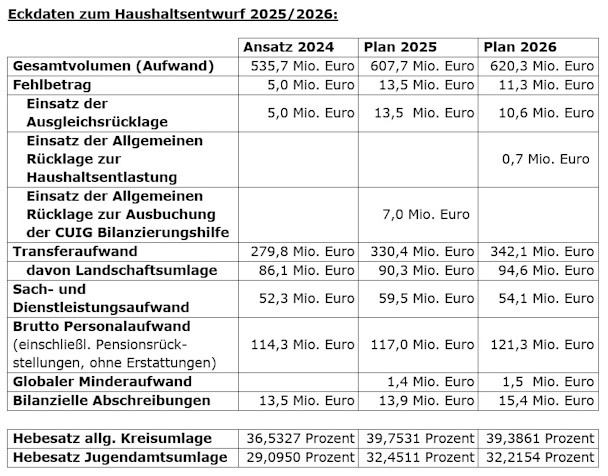 Der Kreishaushalt weist ein Gesamtvolumen von 607,7 Mio. Euro auf. Davon entfallen allein auf die Transferaufwendungen die Rekordsumme von 330,4 Mio. Euro in 2025 und 342,1 Mio. Euro in 2026 (Ansatz 2024: 279,8 Mio. Euro). Dieser Anstieg ist hauptsachlich den gestiegenen Aufwendungen im Sozialetat und im Jugendhilfeetat sowie dem Anstieg der Landschaftsumlage geschuldet.