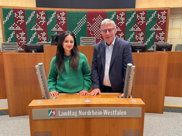 | Brianna Lioveanu und Bodo Löttgen am Rednerpult des Landtags von Nordrhein-Westfalen. (Foto: Thomas Jüngst) |
