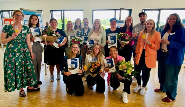| Mitarbeitende der AGewiS freuen sich mit den erfolgreichen Absolventinnen und Absolventen über deren Qualifikation als „Verantwortliche Pflegefachkraft“. (Foto: AGewiS/Nina Broich-Glagow) |