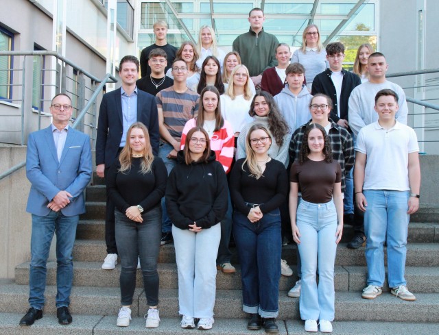 Zum 01.10.2025 starteten 22 junge Leute in die Ausbildung beim Oberbergischen Kreis. Die Azubis absolvieren ihre Lehre im Rettungsdienst. Personaldezernent Stefan Hesse (l.) und Ausbildungsleiter Joschka Hirte (2.v.l.) haben die neuen Auszubildenden im Kreishaus begrüßt. (Foto: OBK) |
