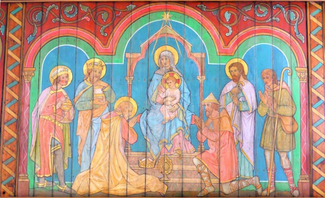 Morsbach - Jedes Jahr rückt das farbige Weihnachtsbild in der Basilika von Morsbach in den Blickpunkt der gläubigen Gottesdienstbesucher. Auf der hölzernen Flachdecke über dem Mittelschiff ist nicht nur in der feierlichen Christmette die Darstellung der Geburt Jesu mit Maria und Josef sowie den Hirten und den Heiligen Drei Königen zu sehen.
