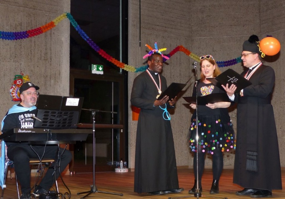 Auch das Pastoralteam war wieder mit von der Partie. Als „Die Kirchensänger von der heiligen Cäcilia“ hatten sie die Beatles-Songs „Yellow Submarine“ und „Yesterday“ umgetextet, und das klang dann von Pfarrverweser Markus Brandt, Kaplan Arnauld Zadji, Gemeindeassistentin Cornelia Hardieß und Kirchenmusiker Dirk van Betteray so: „Wir singen alle für Cäcilia“ und „Pfarrer sein …“. Fehlen durfte beim Pfarrkarneval auch nicht ihre „Allerheiligenlitanei“.