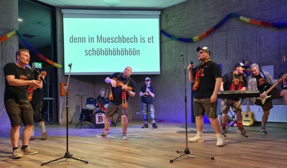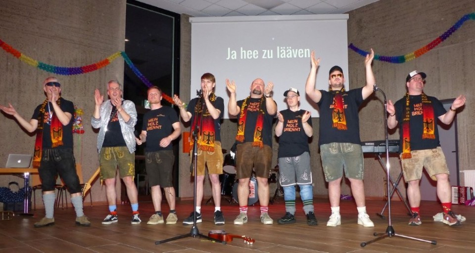 Nächster Höhepunkt: „Bel Kantholz“, die Nachwuchstruppe des MGV Eintracht. Sie hatte wieder Lieder und kurze Videospots mitgebracht. „Ihr zeigt uns die Liebe zur Republik in Bild und Ton“, kündigte Moderator Rinscheid die acht „Müeschbejer Jongs“ an. Sie kritisierten musikalisch das obere Bahnhofsgelände als „Schandflecken“ und schlugen vor, an dessen Stelle ein „Lokal für Allemann“ einzurichten. Mit zwei weiteren Liedern zollten sie eine Hommage an die Wolpertinger für deren 40-jähriges Bestehen in diesem Jahr und an den SV Morsbach „für die schöne, neue, grüne Wiese“, eben den neuen Kunstrasen. Als aktuelle Hymne gaben sie „Mueschbech, he sinn mer deheem!“ zum Besten.