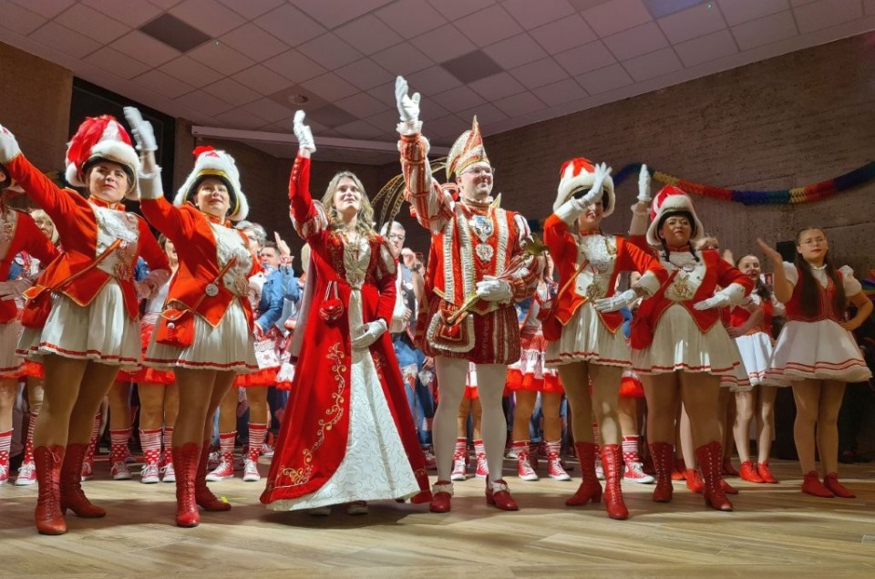 Die Bühne fasste kaum das gesamte Schmölzje, als die Karnevalsgesellschaft Rot-Weiß Denklingen mit Prinzessin Lisa und Prinz Robin I., den Pänz von der Burg, der Burggarde sowie dem Vorstand aufmarschierte. Sie waren mit zwei Reisebussen gekommen, und ihr Motto lautete „Zosamme sinn mer eins!“. Für den tolle Auftritt und die Tänze ernteten sie tosenden Applaus.
