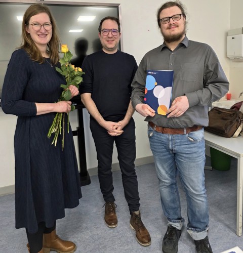 Die VHS-Leitung Sarah Krämer (l.) und Dr. Peter Ley (M.) gratulierten zu einem besonders gutes Ergebnis, das Malte Paul (r.) mit seinem makellosen 1er-Zeugnis erreicht hat. (Foto: OBK)