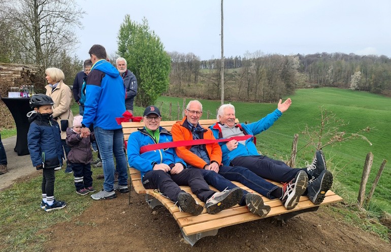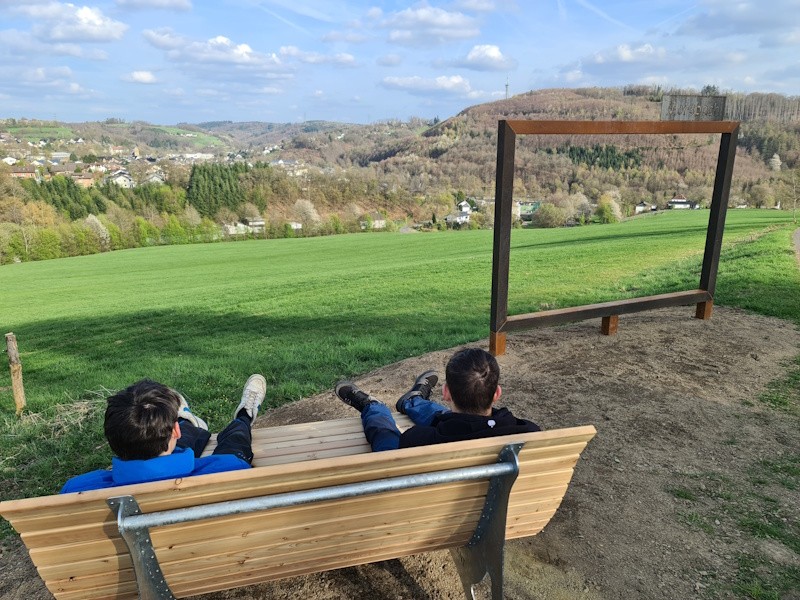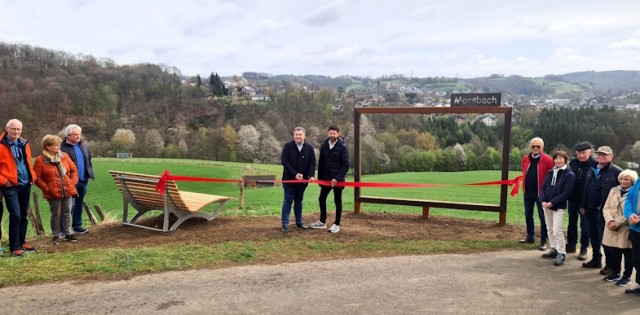 Morsbach - Morsbach ist umgeben von zahlreichen Wanderwegen und Hügeln, von denen aus der Wanderer interessante Panoramablicke genießen kann. Seit Sonntag (12.04.2026) ist der Ausblick von einem der Hügel noch attraktiver geworden. Auf dem Heider Berg hat der Heimatverein ein neues, hölzernes Waldsofa und auch noch daneben einen Fotorahmen mit dem Schriftzug „Morsbach“ eingeweiht.