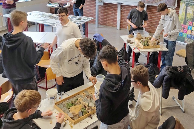 Wie sollte der Schulhof an der TOB in Zukunft vor dem Hintergrund des Klimawandels aussehen? Mit dieser Frage befassten sich kürzlich Schülerinnen und Schüler des MINT-Kurses der Schule - wobei die vier Buchstaben für Mathematik, Informatik, Naturwissenschaften und Technik stehen. Im Rahmen des Workshops waren sie aufgerufen, „mit den Händen zu denken“. Konkret konnten die Jugendlichen in Kleingruppen Fantasiemodelle des Schulhofs entwerfen. Zur Gestaltung standen ihnen verschiedene Naturmaterialien zur Verfügung wie Steine, Sand und Moose.