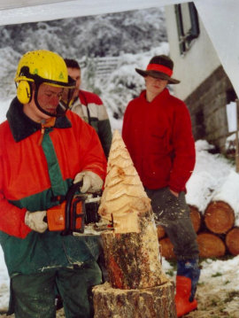 Zu sehen sind hochwertiges Holzspielzeug, Gartenmöbel, Krippen, Forstpflanzen, Pfähle, Kaminholz, Schmuckreisig und vieles mehr.