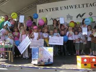 Richtig eng wurde es vor und auf der Bühne, als Moderator Rüdiger Hockamp zur Verleihung des Umweltpreises an die Kindergärten und Grundschulen aufrief. Kerstin Gipperich vom Oberbergischen Kreis und Vera Zielberg (AggerEnergie) übergaben die Urkunden und Geldpreise im Gesamtwert von 3000 Euro. Rainer Hervol (AggerEnergie) sorgte dafür, dass jedes Kind auf der Bühne ein Paket Straßenkreide bekam. Erste Plätze hatten der evangelische Kindergarten "Samenkorn" aus Wiehl, die katholische Montessori-Kindertagesstätte "Zur heiligen Familie" aus Engelskirchen, der evangelische Kindergarten "Arche" aus Nümbrecht und der Margot-Paazig-Kindergarten aus Gummersbach belegt. Jede Einrichtung erhielt 300 Euro. 200 Euro bekamen die Zweitplatzierten: Kindergarten "Unterm Schirm", Drespe, evangelischer Kindergarten Steinberg, Gummersbach, DRK-Kindertagesstätte "In den Gärten", Nümbrecht, Johanniter-Kindergarten, Nümbrecht, Johanniter-Kindertagesstätte "Wirbelwind", Wipperfürth, Kindertagesstätte "Sternenkinder", Gummersbach. Mit 150 Euro wurden die Drittplatzierten für ihre eingereichten Arbeiten zum "Umweltpreis" belohnt: Kindergarten "St. Angela", Gummersbach, Regenbogen-Grundschule, Wildbergerhütte, AWO_Kindergarten, Gaderoth und die Grundschule Marienhagen. Die Fahrt mit dem Heißluftballon, gestiftet von AggerEnergie gewann zum Abschluss die Wiehlerin Angela Klein.