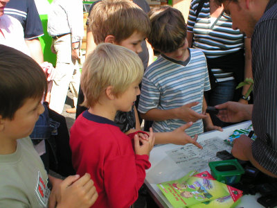 Viele Mitmachaktionen des NABU Oberberg luden Groß und Klein dazu ein, die Wichtigkeit und den Erhalt des oberbergischen Baumbestandes zu begreifen und zu ergreifen. Zum Beispiel durch eine 225 Jahre alte Eichen-Baumscheibe, auf der die Wettbewerbsteilnehmer erraten sollten, wann die Kartoffel in Deutschland eingeführt wurde, die „Meuterei auf der Bounty“ stattfand, oder wann Goethe lebte. Selbst für Humanisten keine einfache Übung. Zur Belohnung gab es einen Baumsetzling. (oh-13.09.2006 15:15)