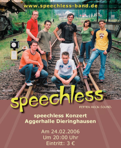 Sei Januar 2006 spielt „speechless“ mit einer leicht veränderten Besetzung. Da der Keyboarder Albert Fröse die Band verlassen hat, haben sie jetzt mit Viktor Sawatzki einen zweiten E-Gitarristen an Bord, womit der Sound jetzt gitarrenlastiger und rockiger ist. Infos: www.speechless-band.de (oh-6.2.2006 21:45)