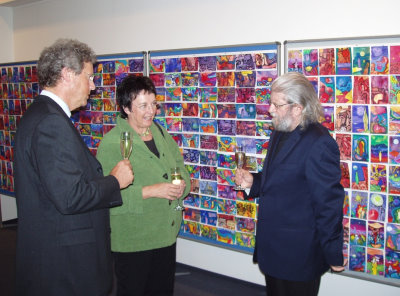 Solche postkartengroßen „Daub-Touris“ hatte der Maler zuvor an alle Bundestagsabgeordneten geschickt. Diese Aktion nannte sich: „Jedem Deutschen einen Daub“. Mit den Bundestagsabgeordneten als „Volksvertreter“ wollte Daub also stellvertretend alle Deutschen erreichen. „Viele Abgeordnete haben ihren Daub ins Büro gehängt“, berichtete Flosbach, der dem Künstler die Ausstellungsmöglichkeit in der Hauptstadt vermittelt hatte und mit einem Grußwort eröffnete. Prominentester Gast war Bundesjustizministerin und Bundestagsabgeordnete Brigitte Zypries, die sich von Daub persönlich durch die Ausstellung führen ließ. (oh-29.08.2006 17:19)