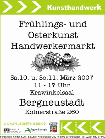 Der Kunsthandwerkermarkt findet statt am Samstag und Sonntag, 10. und 11. März 2007, von 11 - 17 Uhr, im Krawinkelsaal Bergneustadt, Kölnerstraße 260. Veranstalter ist die Stadt Bergneustadt und der Förderkreis für Kinder, Kunst & Kultur. (oh-26.02.2007 15:06)