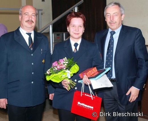 Wehrführer Guido Schulz und Bürgermeister Becker-Blonigen sprachen Mandy Schulz großes Lob und Anerkennung aus.